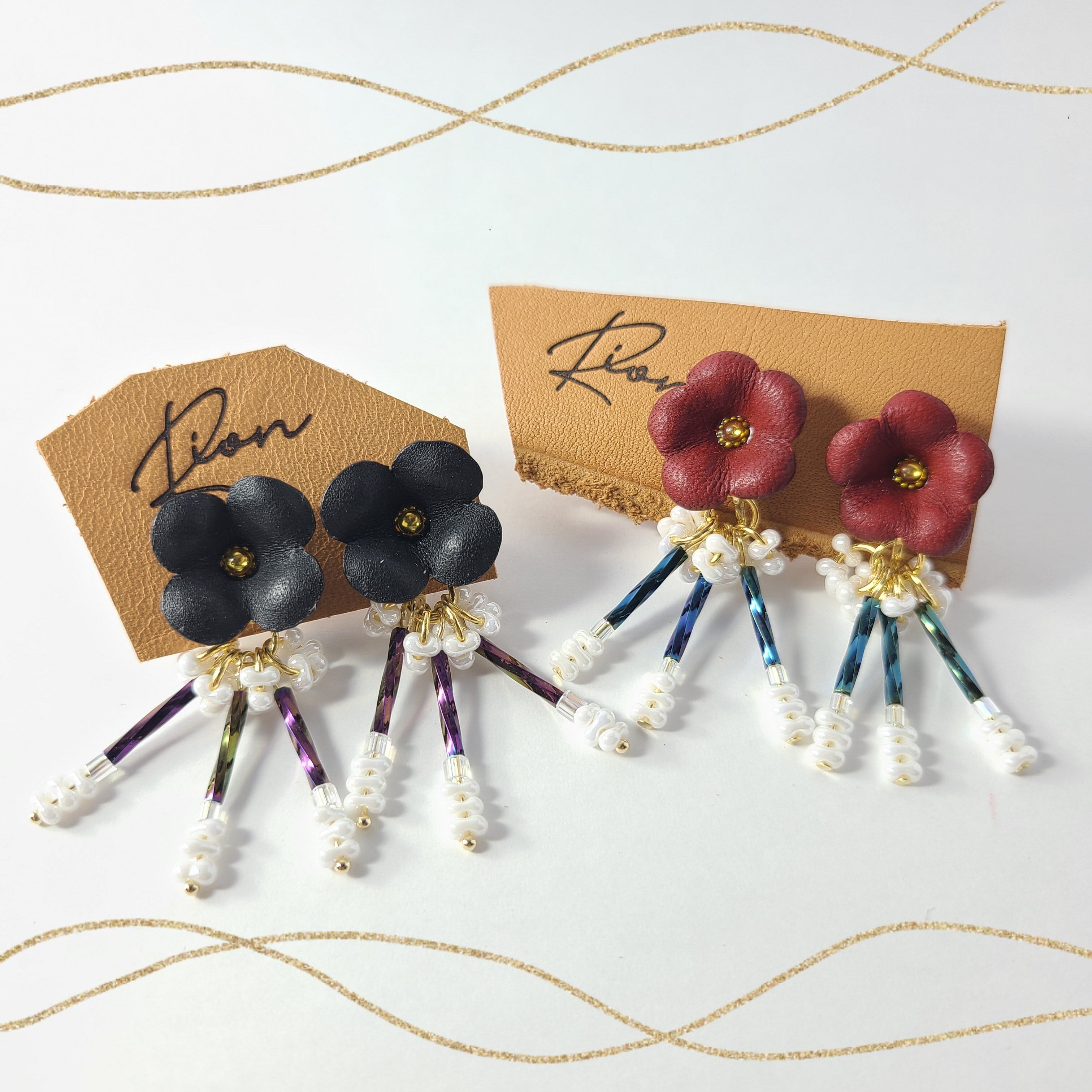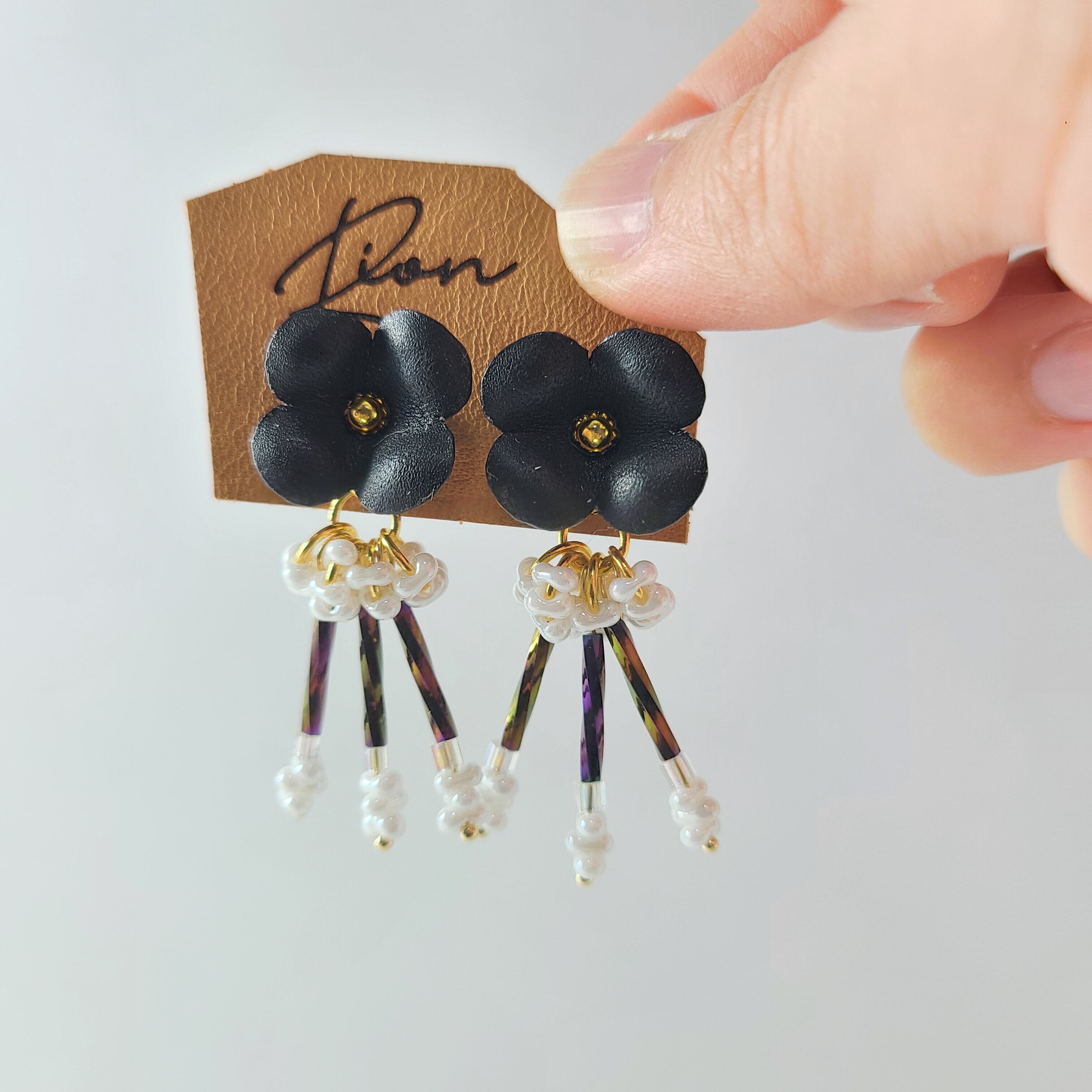 この魅力的なイヤリングとピアスは、革で作られた花と色とりどりのビーズで仕上げられ、耳元で華やかに揺れます。