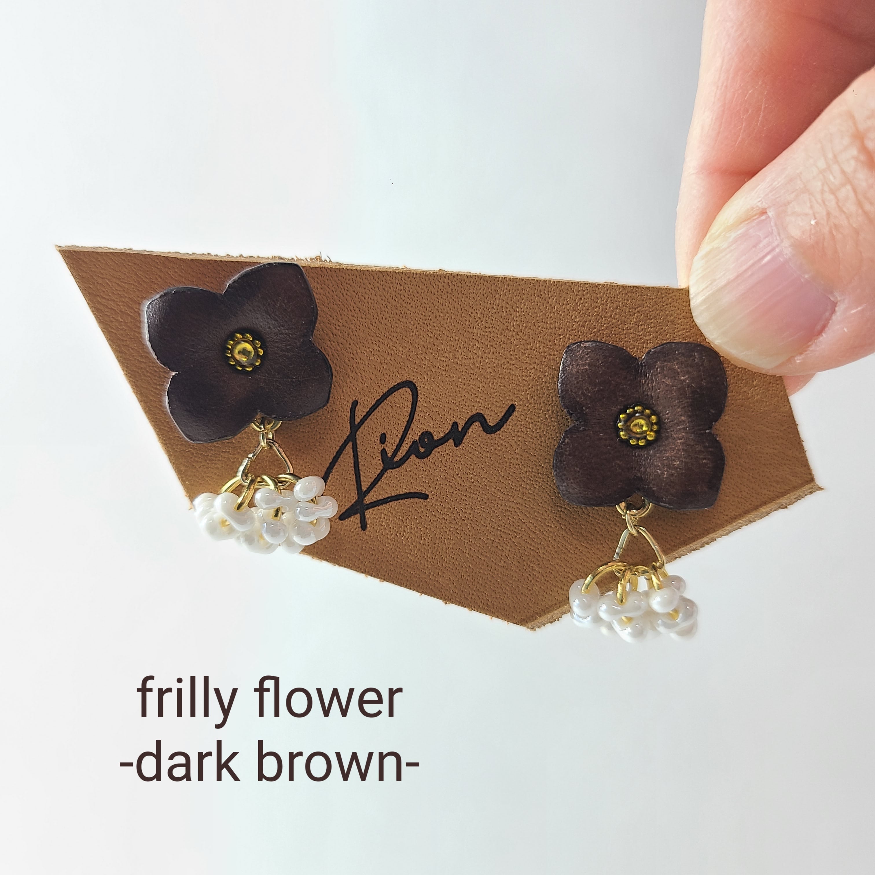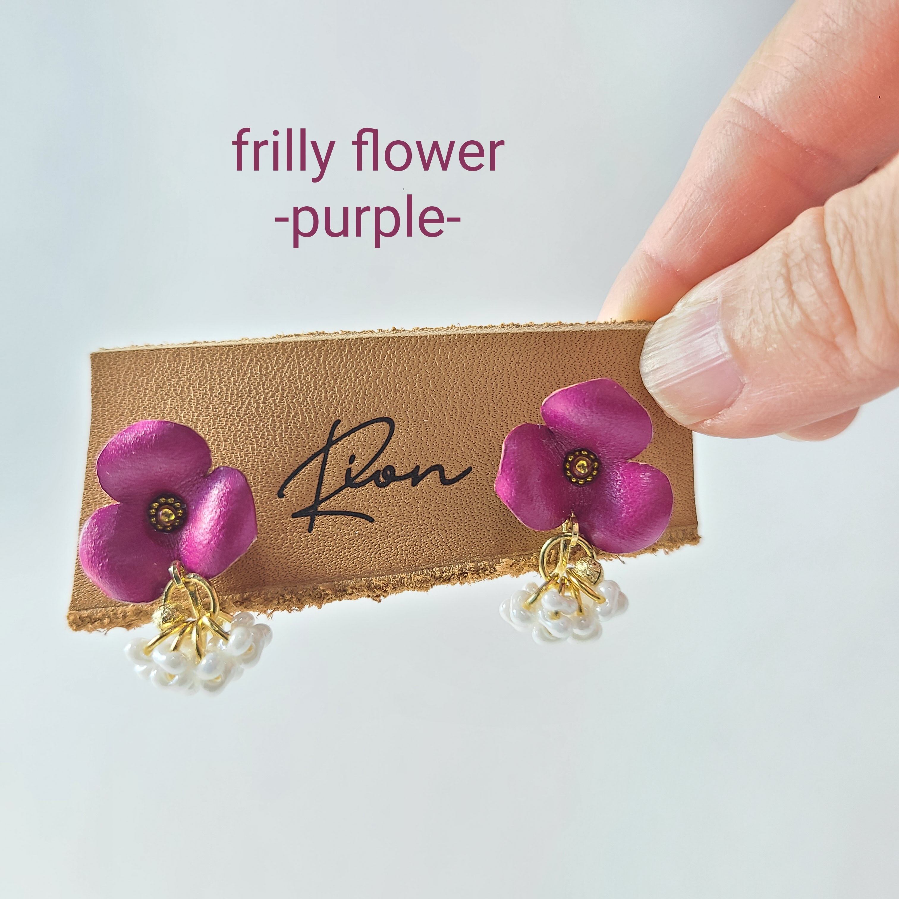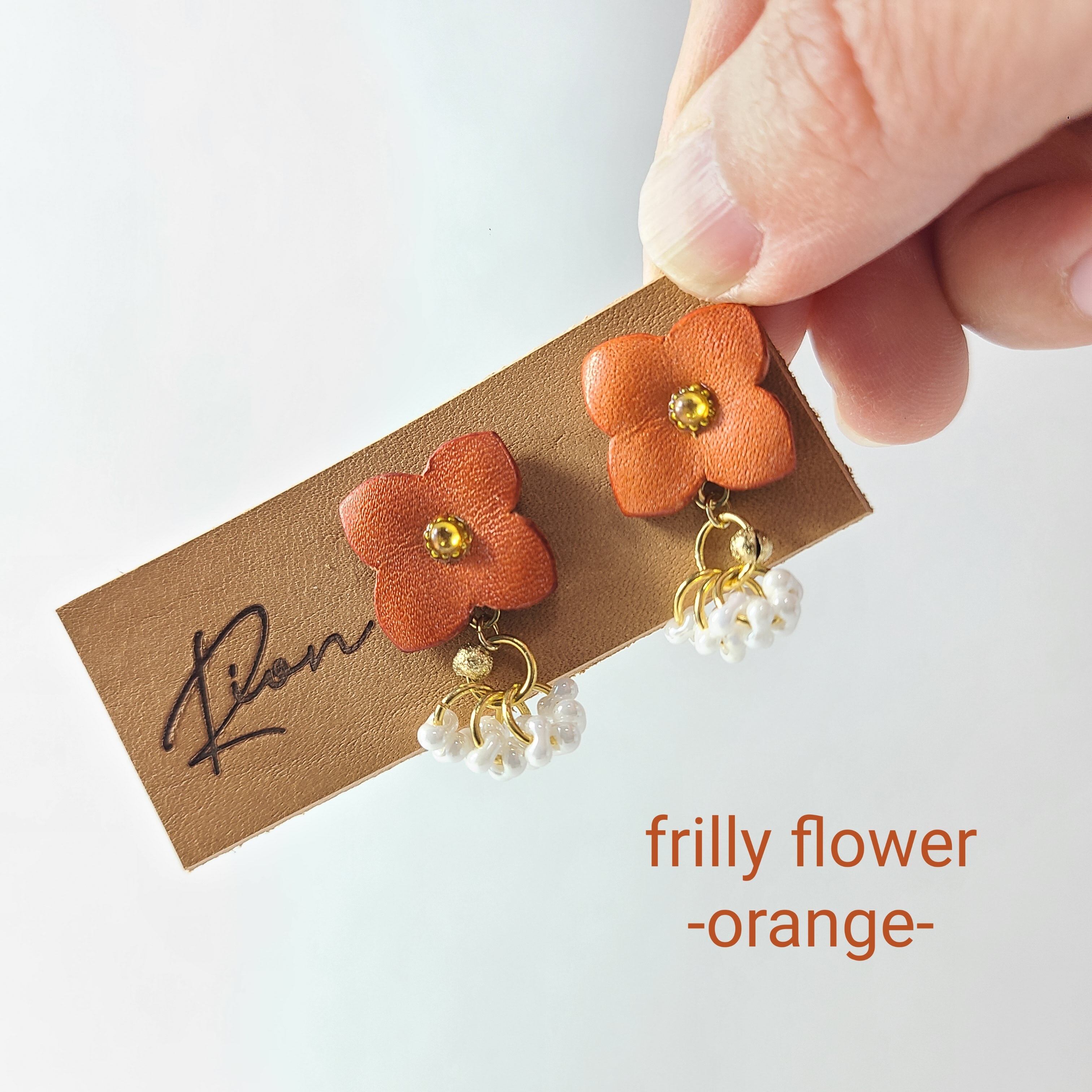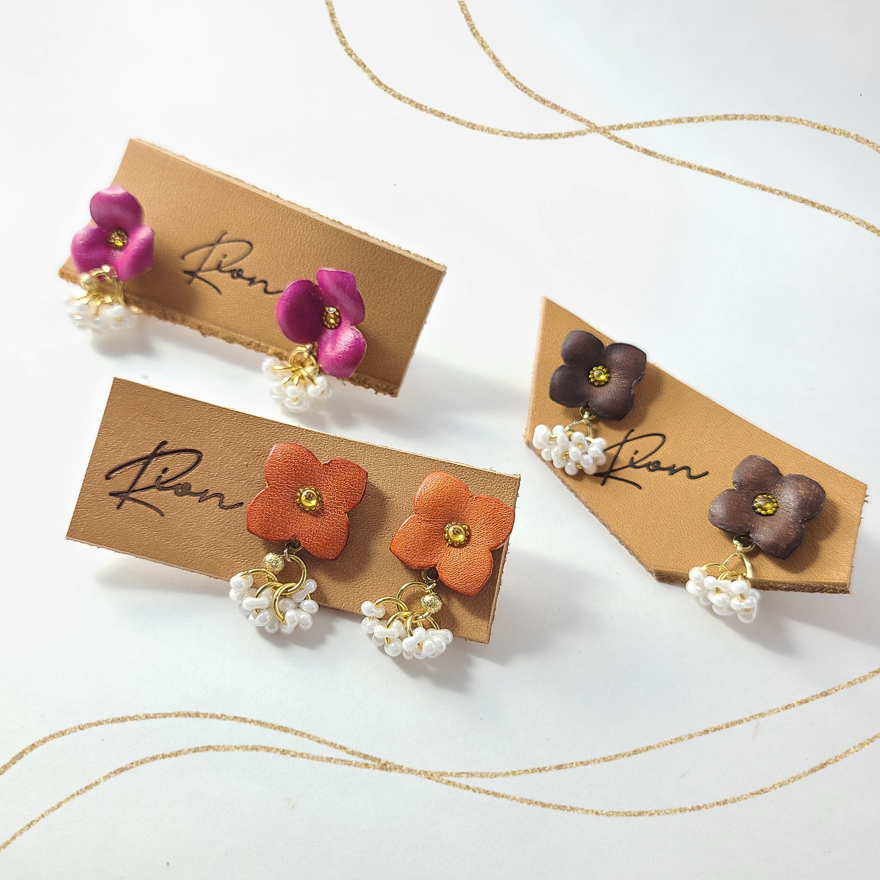 この魅力的なイヤリングとピアスは、革で作られた花と白いファルファーレビーズで仕上げられ、耳元で華やかに揺れます。